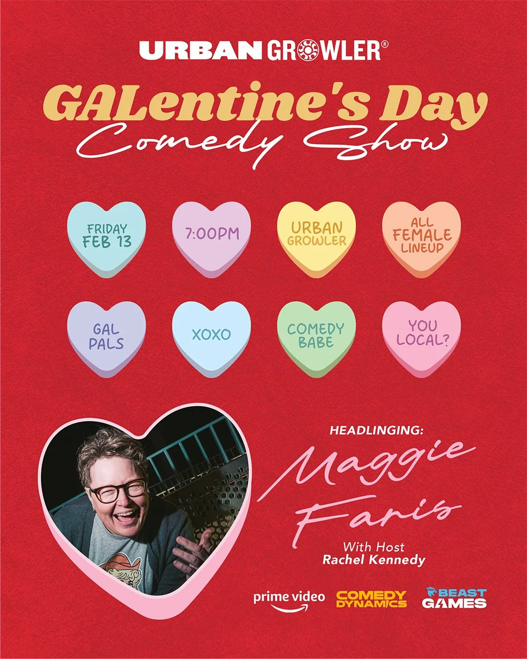 Join us for the GAL-entine’s Day Comedy Show at Urban Growler—featuring an all-female lineup of hilarious local comedians, hosted by Rachel Kennedy, and headlined by nationally recognized comic Maggie Faris.